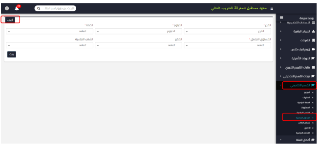 بعد ذلك تنتقل المشرفة إلضافة الجدول الدراسي، وذلك من أيقونة القسم األكاديمي واختيار الجداول الدراسية والنقرعلى أيقونة أضف الظاهرة أعلى الصفحة على اليسار.